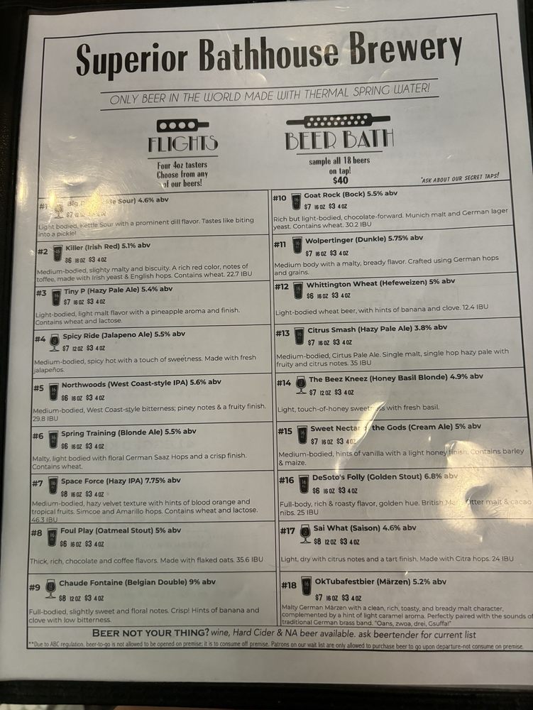 Introducing the menu at Superior Bathhouse Brewery in Hot Springs, Arkansas, where you can enjoy burgers and craft beers brewed with hot spring water. The unique location and vibe add to the experience, though some reviewers mention the lack of air conditioning. The menu offers a variety of options, including vegan and limited vegetarian choices. Customers rave about the steak fries, smash burgers, pretzels with beer cheese, and unique beer flavors like dill pickle and jalapeño. The friendly and attentive service, along with the historic charm, make this brewery a must-visit. Don't miss out on the classic root beer and happy hour specials. Whether you're looking for a casual lunch spot with outdoor seating or a place to enjoy good food and craft beer, Superior Bathhouse Brewery has something for everyone.